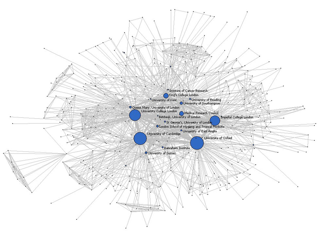 Size of the dots represent received UK grants with global partnerships