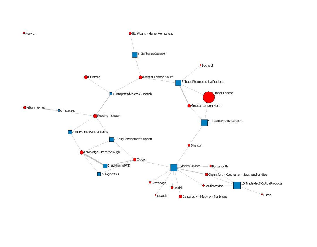 Regional specialisation in the biomedical and health technology cluster in the Greater South East, UK (2008)