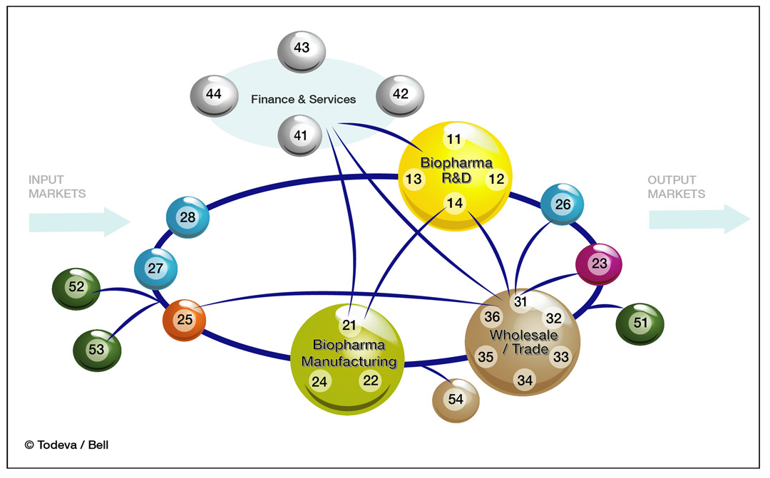 Relationships between Finance & services, Biopharma R&D, Biopharma Manufacturing, Wholsales / Trade, Input and outputs markets