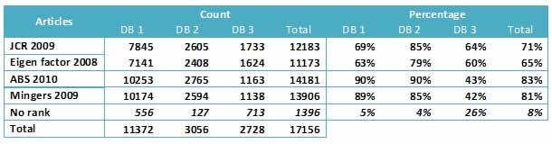 The database includes 17 156 articles published by UK authors in 2 314 international journals for the period 2000-2008, that contribute to the global knowledge depository for business and management disciplines. All articles are linked up to 4 ranking methods, where 83% of them have and ABS rank, and 71 % are in journals where citation impact is measured. Overall 47% of journals (or 49% for the UA36 only) are monitored for citation impact, which raises the question of the value of the 53% tail of journals that are not registered with the ISI web of science