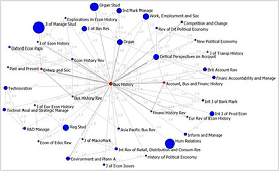 This is a collaborative project that aims at developing a new method of journal ranking. It explores network analysis techniques applied to journal Ego-networks. We have mapped the network relations between the journal of Business History and all other directly associated journals that represent the Business History academic field. The first output from the project was a collaborative paper: Rowlinson M., Todeva, E., Harvey, C., Kelly, A., Keskinova, D, Morris, H. (2010) ‘Editorial: Business History in the UK Research Assessment Exercise’, European Business History Association, Newsletter Issue 31. Authors that publish in the Business History Journal, publish also in the following fields: Fig. 1. Embeddedness of Business History